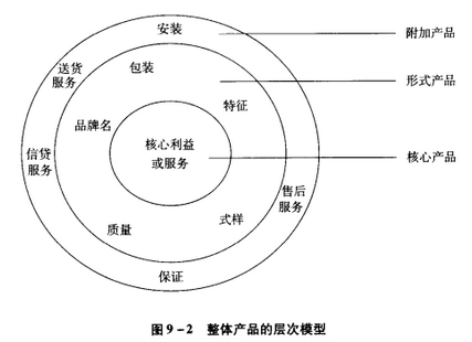 整體產(chǎn)品概念的提出,是從消費者需求的角度出發(fā),使產(chǎn)品突破了生產(chǎn)過程制造出來的有形實體的局限,向前延伸至產(chǎn)前的款式、包裝、商標設(shè)計,向后擴展到產(chǎn)后的服務(wù)、安裝、維修等環(huán)節(jié),使產(chǎn)品達到了產(chǎn)前、產(chǎn)中和產(chǎn)后的整合與協(xié)調(diào)。實際上,整體產(chǎn)品概念就是指從整體上把握產(chǎn)品的概念,即從消費者購買產(chǎn)品所獲得全部利益和滿足這一角度來把握產(chǎn)品的概念。如圖9—2所示。