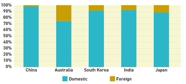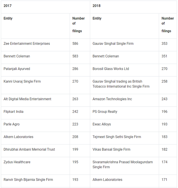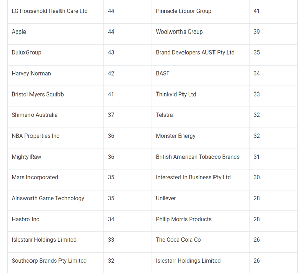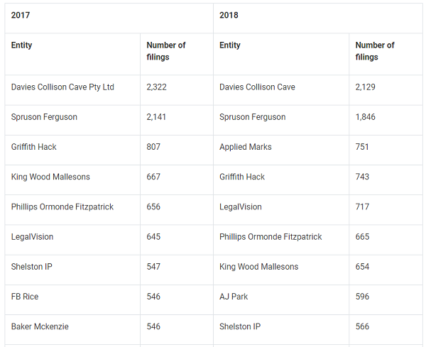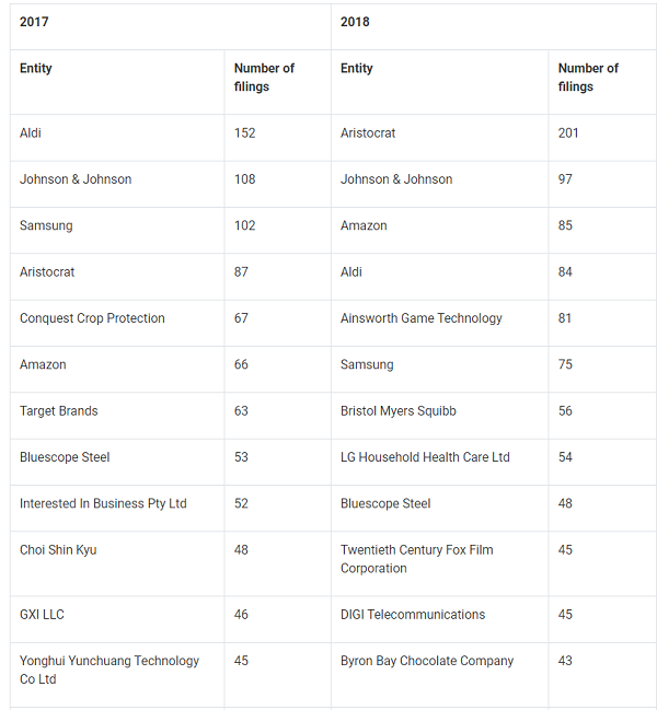 外國實體在澳大利亞市場的突出表現(xiàn)體現(xiàn)在2018年25大公司申報人排名中(見表3)。超過一半的頂級報名者來自海外,強生,亞馬遜和三星等國際巨頭都躋身前十名。該榜單上其他值得一提的還有兩家賭場游戲公司Aristocrat和Ainsworth Game Technology。自2017年以來提高了備案活動。