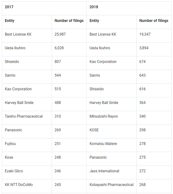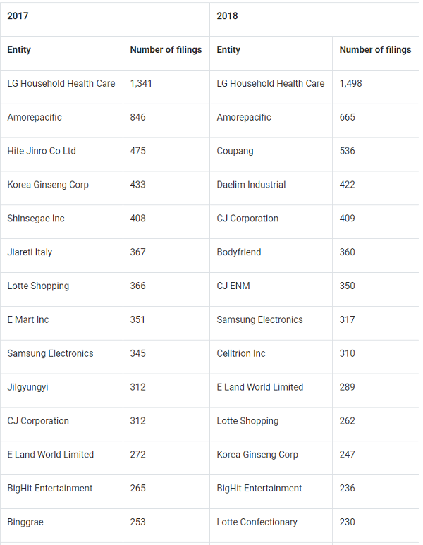 國內申請人占韓國人登記的大部分,并且可能是未來幾年經濟增長的最大貢獻者。毫不奇怪,它們在前25名公司申報人名單中也占主導地位(請參見表6)。LG Corporation的子公司LG Household Health Care,化妝品公司Amorepacific和在線服務提供商Coupang是2018年的主要申請人。