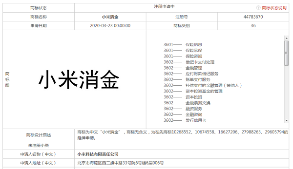 巨人網(wǎng)絡(luò)通訊聲明:本文標(biāo)題《小米科技有限責(zé)任公司申請的“小米消金”商標(biāo)已初審公告》,本文關(guān)鍵詞 小米,科技,有限責(zé)任,公司,;如發(fā)現(xiàn)本文內(nèi)容存在版權(quán)問題,煩請?zhí)峁┫嚓P(guān)信息告之我們,我們將及時(shí)溝通與處理。本站內(nèi)容系統(tǒng)采集于網(wǎng)絡(luò),涉及言論、版權(quán)與本站無關(guān)。