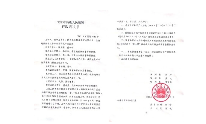 此后,歷經(jīng)三年之久,從北京知識產(chǎn)權(quán)局到國家知識產(chǎn)權(quán)局,再到北京最高人民法院,“周大黑”面對異議,沒有妥協(xié),據(jù)理力爭。終于在2021年7月底,最高人民法院作出判決:撤銷北京知識產(chǎn)權(quán)局行政判決書,由國家知識產(chǎn)權(quán)局針對周黑鴨就周大黑商標(biāo)提出的無效宣告請求重新作出裁決,周大黑商標(biāo)訴訟爭議終于告一段落。這也意味著,漢中民營企業(yè)對陣國內(nèi)食品行業(yè)大佬,打贏了這場“商標(biāo)保衛(wèi)戰(zhàn)”。