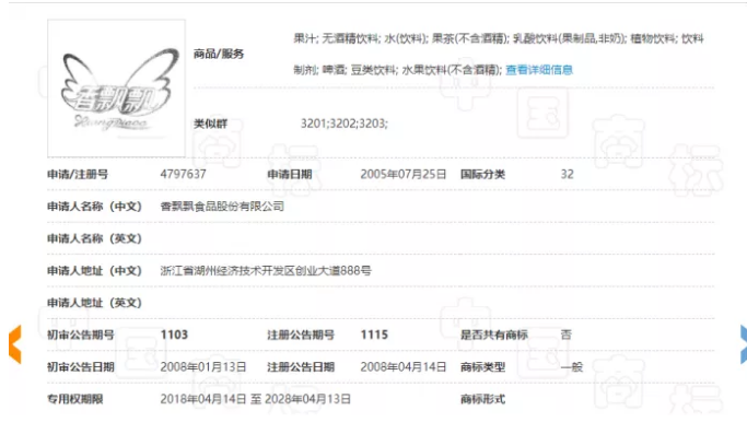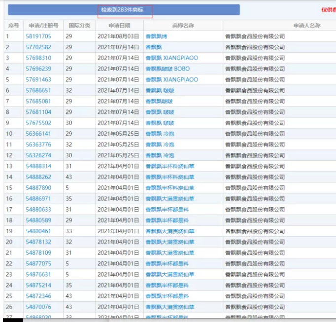 2006年起,“香飄飄”商標(biāo)的搶注如雨后春筍般接連而起。剛開始,搶注主體為一些個(gè)人,隨后,商標(biāo)申請(qǐng)注冊(cè)主體擴(kuò)展至各行各業(yè),諸如“紡織印染公司”“電器公司”“服飾公司”等,當(dāng)然,搶注者中同樣存在不少食品類公司,中國(guó)商標(biāo)網(wǎng)顯示,截止目前,“香飄飄”相關(guān)商標(biāo)的注冊(cè)申請(qǐng)已達(dá)283件。