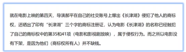 這不,電影上映沒幾天,有些媒體便報(bào)道稱“長(zhǎng)津湖”商標(biāo)已被注冊(cè),《長(zhǎng)津湖》電影侵犯商標(biāo)權(quán)。
