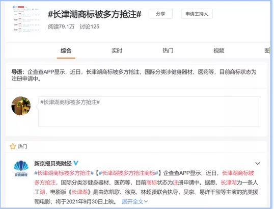 實(shí)際上,早在9月份,“長(zhǎng)津湖商標(biāo)被搶注”的話題就被爆料,但未受到關(guān)注。
