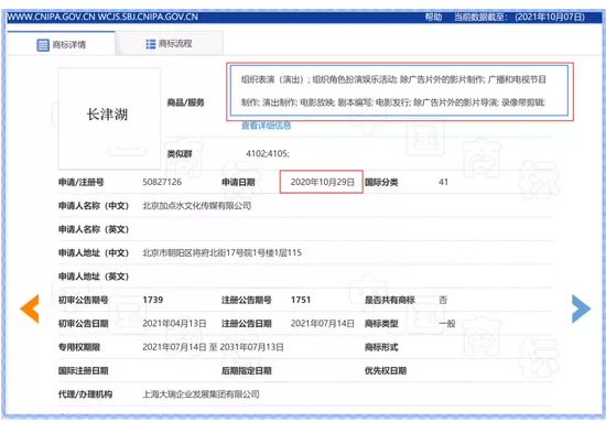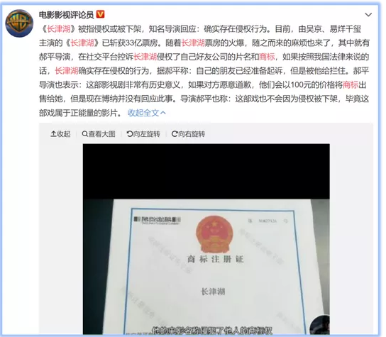 據(jù)某導(dǎo)演爆料其擁有第41類“長(zhǎng)津湖”商標(biāo)所有權(quán)和著作權(quán)