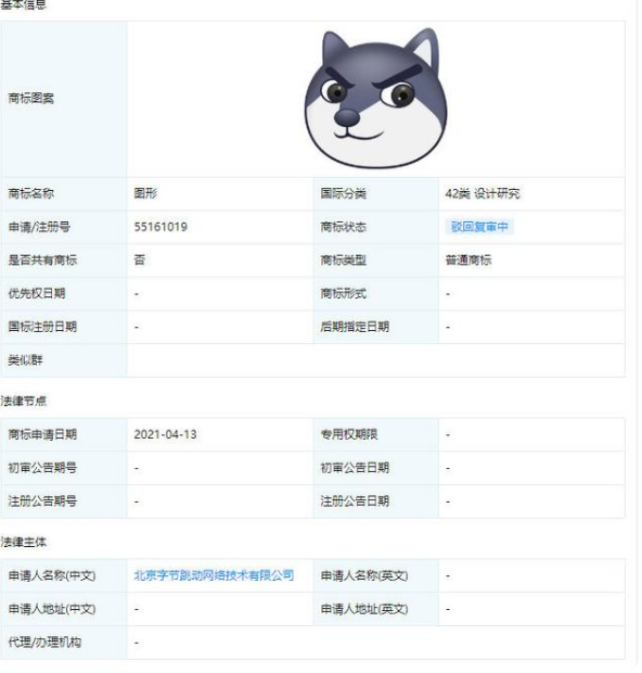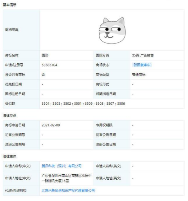 9 月 22 日消息 近期,騰訊、字節(jié)申請的部分狗頭商標流程狀態(tài)變更為駁回復審,國際分類涉廣告銷售、設計研究等。此外,目前微博公司申請的狗頭商標狀態(tài)均為等待實質審查。