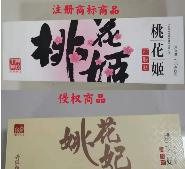 注冊(cè)商標(biāo)與侵權(quán)產(chǎn)品的“姚花妃”標(biāo)識(shí)均由三個(gè)漢字組成,都采用軟筆書(shū)法字體,容易導(dǎo)致混淆,侵犯了“桃花姬”注冊(cè)商標(biāo)專用權(quán)。