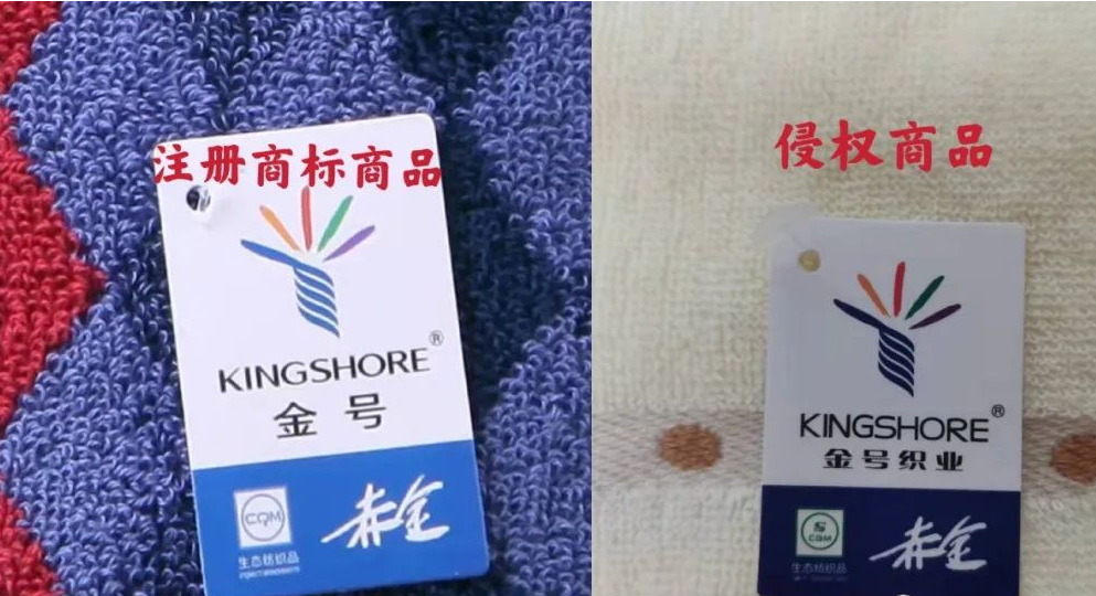 侵權(quán)商品的吊牌上“金號(hào)織業(yè)”字樣,水洗標(biāo)上“金號(hào)”字樣,與注冊(cè)商標(biāo)相比較,吊牌連接線及洗滌標(biāo)處與注冊(cè)商標(biāo)特征不符。侵犯了“金號(hào)”注冊(cè)商標(biāo)專用權(quán)。