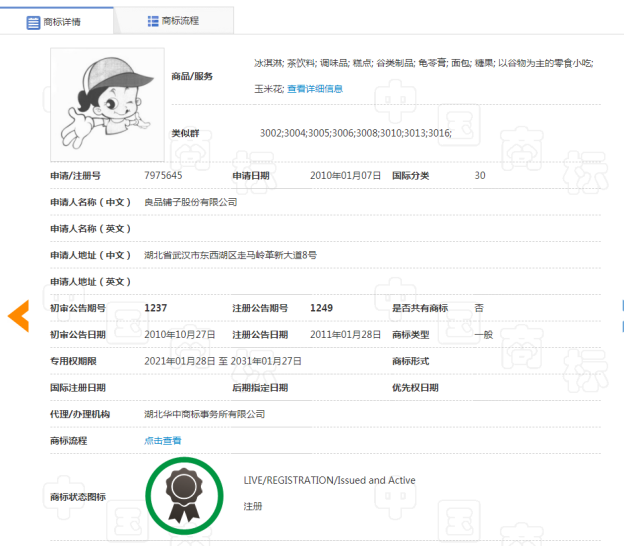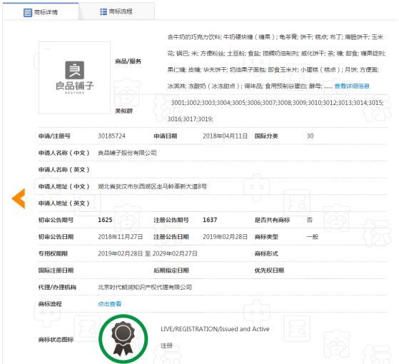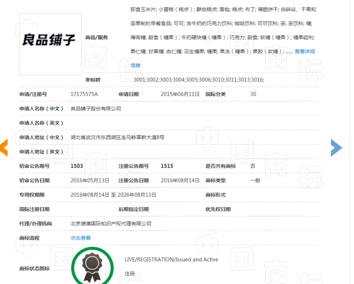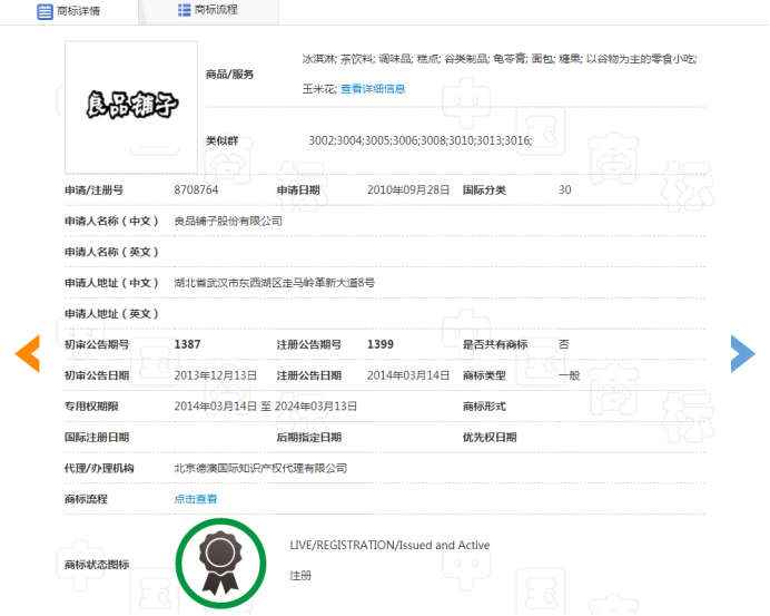 下面以【良品鋪子】商標為例,文字、圖形商標分開注冊,后期使用時,可分開,可組合使用。