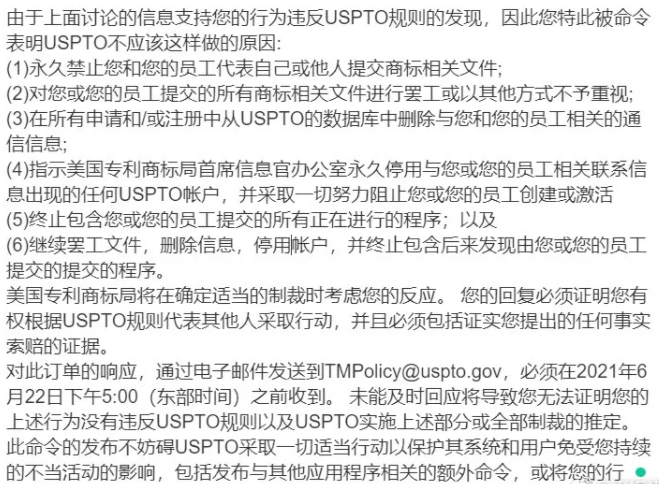 自去年以來(lái),用戶必須注冊(cè)并使用MYUSPTO賬號(hào)才能通過(guò)商標(biāo)電子申請(qǐng)系統(tǒng)(TEAS)訪問(wèn)電子表格并提交商標(biāo)文件。一旦USPTO發(fā)生相關(guān)代理商和機(jī)構(gòu)通過(guò)任何不正當(dāng)?shù)男畔⑿畔⒒蛱峁┨摷?、虛?gòu)或欺詐性的行為,將會(huì)進(jìn)行相應(yīng)的制裁,這不“深圳市某知識(shí)產(chǎn)權(quán)有限公司”就中彩了,其因?yàn)椤北I用律師資質(zhì)等虛假信息遞交商標(biāo)”造成了近14000個(gè)美國(guó)商標(biāo)被要求強(qiáng)制撤銷,因?yàn)镾UPTO規(guī)則商標(biāo)申請(qǐng)中規(guī)定有任何類型的虛假信息都會(huì)損害商標(biāo)注冊(cè)的完整性,如果提供虛假、虛構(gòu)或欺詐信息的人將受到USPTO的制裁。