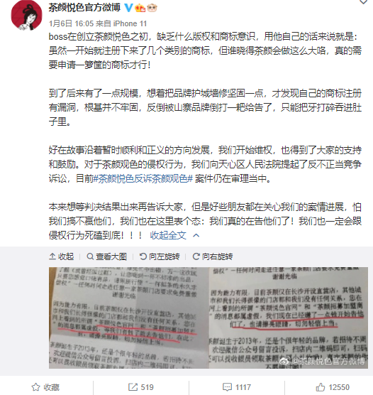 2021年1月4日,茶顏悅色起訴茶顏觀色不正當競爭案,在湖南省長沙市天心區(qū)人民法院開庭。