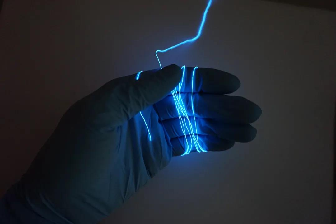 該方法可以將發(fā)光器件制備與織物編織過程相統(tǒng)一。據(jù)介紹,團(tuán)隊(duì)利用工業(yè)化編織設(shè)備,已經(jīng)制成了長(zhǎng)6米、寬0.25米、含約50萬個(gè)發(fā)光點(diǎn)的發(fā)光織物,發(fā)光點(diǎn)之間最小的間距為0.8毫米,能初步滿足部分實(shí)際應(yīng)用的分辨率需求。
