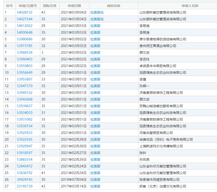 拉面哥爆火后商標被搶注,申請公司三年商標申請224個
