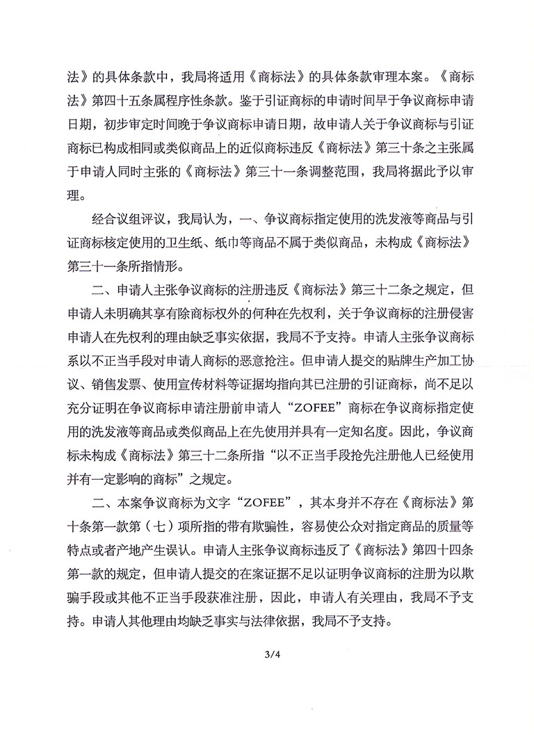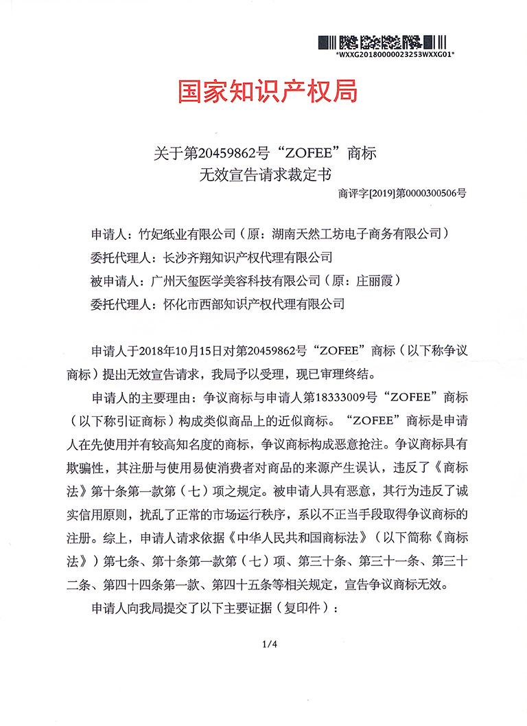 2018年10月 ,竹妃紙業(yè)有限公司向國家知識產(chǎn)權(quán)局提出對2017年08月14日下證,注冊號 20459862,名稱“zoffe”商標(biāo)提出無效宣告的申請。國家知識產(chǎn)權(quán)局于2019年12月對該案件作出了處理,駁回竹妃紙業(yè)有限公司的請示,其注冊號:20459862的商標(biāo)繼續(xù)有效的決議。
