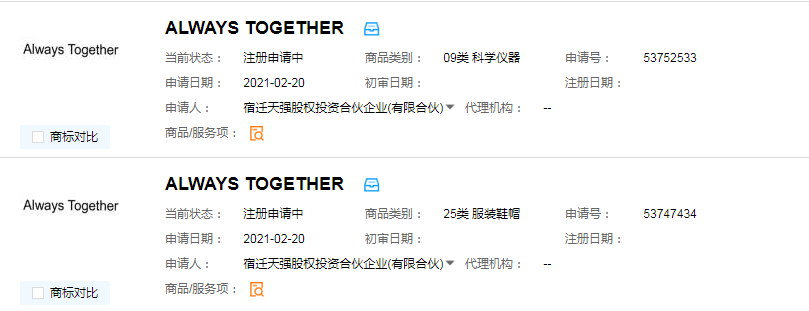 此外,宿遷天強(qiáng)股權(quán)投資合伙企業(yè)(有限合伙)新增“ALWAYS TOGETHER”的商標(biāo)申請信息,國際分類為服裝鞋帽,目前商標(biāo)狀態(tài)顯示為“商標(biāo)申請中”。