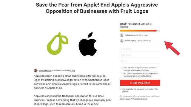 眼看靠自己跟蘋果硬剛是不行了,Prepear轉(zhuǎn)而尋求網(wǎng)友的幫助,在網(wǎng)上發(fā)起聯(lián)署“把梨子從蘋果手里救出來”(Save the Pear from Apple)。結(jié)果可想而知,Prepear的聯(lián)署獲得接近27萬網(wǎng)民支持,蘋果還被網(wǎng)友罵爆了,評論幾乎一邊倒在說,憑什么水果商標只能蘋果自己能用,別人不能用之類的。