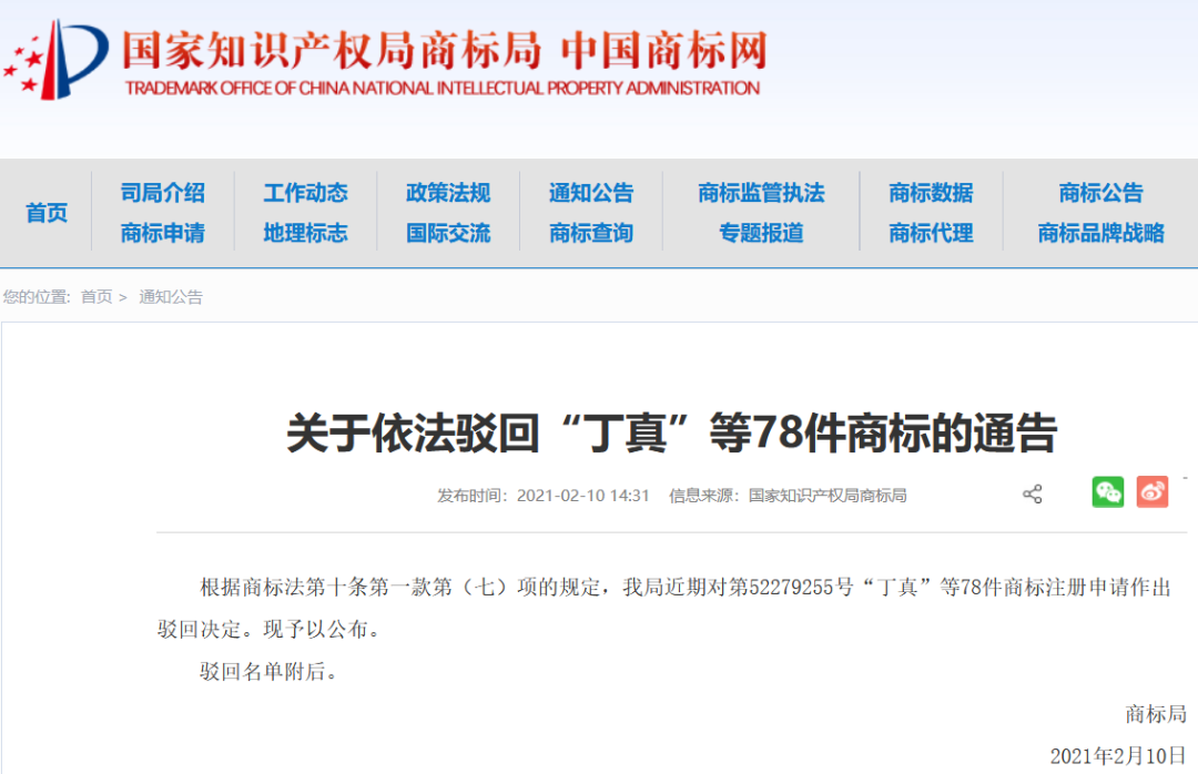 關(guān)于依法駁回“丁真”等78件商標(biāo)的通告