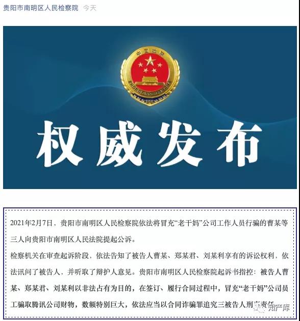 2021年2月7日,貴陽市南明區(qū)人民檢察院依法將冒充“老干媽”公司工作人員行騙的曹某等三人向貴陽市南明區(qū)人民法院提起公訴。
