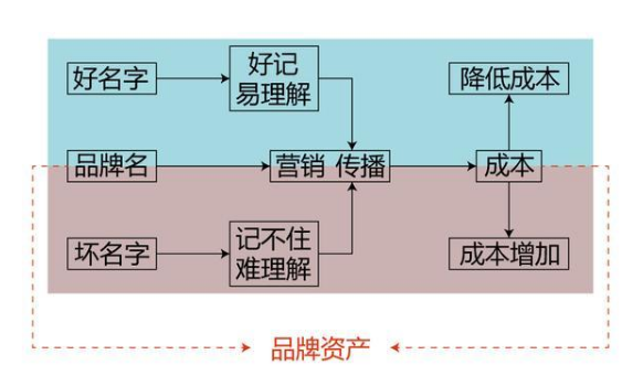 從原理圖中我們可以看出,好名字在營銷傳播中可以節(jié)約企業(yè)成本,不好的名字則反之;企業(yè)投入的這些成本,最終都會形成品牌資產(chǎn);如果花錢投一個不好的名字,這些費用可能會浪費一大部分,甚至積累為零,無法形成品牌資產(chǎn)。
