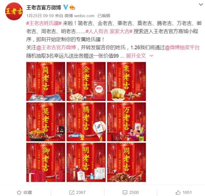 涼茶品牌王老吉在今年的春節(jié)市場(chǎng)中,剛給自己“改了名”,推出了姓氏罐。