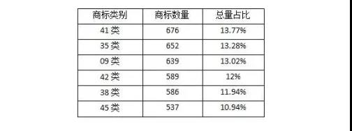 快手公司運營主體是北京達佳互聯(lián)信息技術(shù)有限公司,該公司旗下當(dāng)前共有4908個商標(biāo),已成功注冊商標(biāo)2690個,注冊率54.81%。商標(biāo)申請量最多的類別是41類,其次是35類,9類。商標(biāo)申請量超500的類別共有6個,數(shù)量及商標(biāo)總量占比如下: