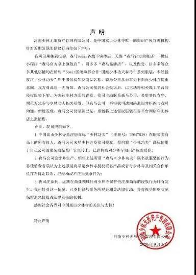 9月1日,少林寺官網(wǎng)發(fā)布聲明稱,森馬Semir各線下實(shí)體店、天貓“森馬官方旗艦店"、微信小程序"森馬官方掌上旗艦店"、拼多多"森馬品牌店",以及淘寶、拼多多等眾多其他店鋪均在銷(xiāo)售"Semir國(guó)潮跨界合作-國(guó)潮少林功夫森馬"系列服裝,未經(jīng)授權(quán)將"少林功夫"用于服裝標(biāo)簽及商品名稱。