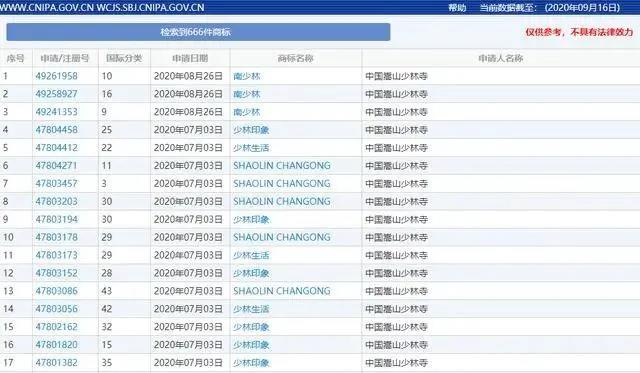 國(guó)家知識(shí)產(chǎn)權(quán)局商標(biāo)局中國(guó)商標(biāo)網(wǎng)數(shù)據(jù)顯示,1997年7月10日至2020年9月20日,嵩山少林寺共申請(qǐng)商標(biāo)666個(gè)。