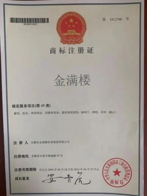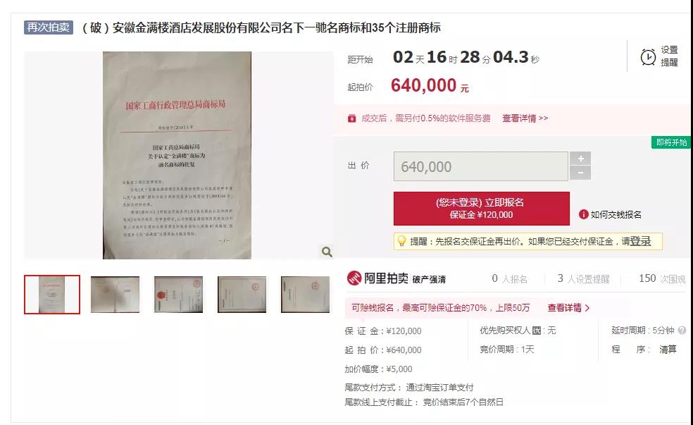 從阿里拍賣上獲悉,“金滿樓”馳名商標(biāo)即將拍賣,一起被拍賣的還有另外35個注冊商標(biāo)。而商標(biāo)的持有人,就是合肥人曾熟知的安徽金滿樓酒店發(fā)展股份有限公司(下稱安徽金滿樓公司),此次拍賣屬于再次拍賣,將于2021年1月10日10時至2021年1月11日10時止(延時除外)在淘寶網(wǎng)阿里拍賣破產(chǎn)強(qiáng)清平臺拍賣,保證金12萬,加價幅度為5000元。此拍賣的監(jiān)督單位是合肥市中級人民法院。