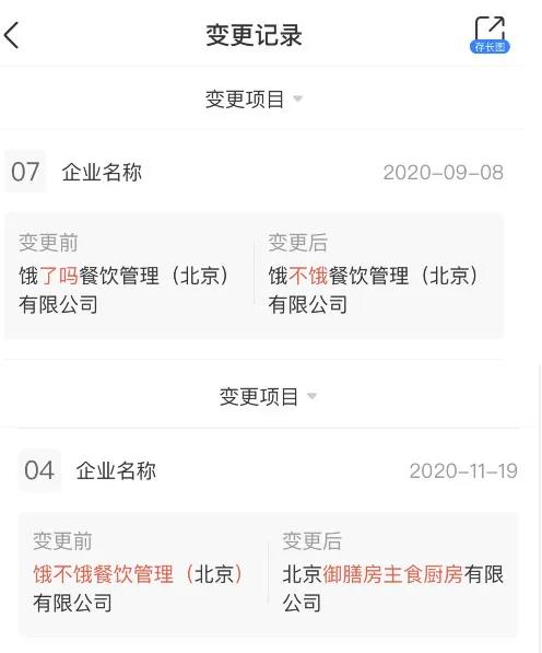 記者注意到,該判決于去年5月29日宣判,2020年9月8日,餓了嗎改名為“餓不餓餐飲管理(北京)有限公司”,2020年11月19日又改名為“北京御膳房主食廚房有限公司”。