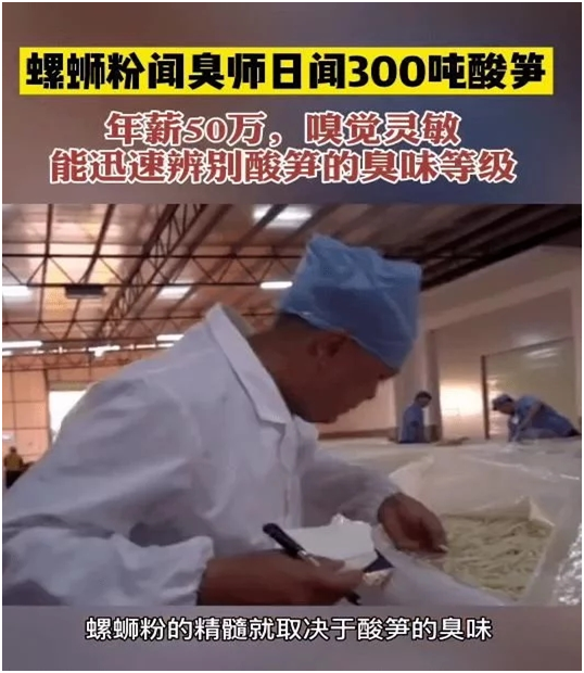 對于喜歡螺螄粉的人來說,這款美食背后的調(diào)味師更加重要,而這也已經(jīng)成為了高薪職業(yè)。近日,“螺螄粉聞臭師年入百萬”引發(fā)熱議,而專業(yè)聞臭師的李永國,每天工作都是觀察筍味,一聞就知道腌制時(shí)間,有沒有放添加劑。曾經(jīng)因?yàn)樯砩嫌兴峁S的味道而被人懷疑,覺得“做這行有點(diǎn)兒尷尬”。但是他并沒有放棄,今年的收入可達(dá)百萬。