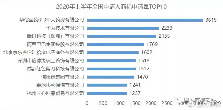2020年上半年,商標(biāo)申請(qǐng)量排名全國(guó)前3的申請(qǐng)人分別為:華佗國(guó)藥(廣東)大藥房有限公司(3615件)、華為技術(shù)有限公司(2233件)、騰訊科技(深圳)有限公司(2155件)。