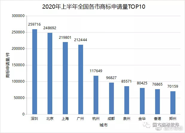 2020年上半年,全國(guó)商標(biāo)申請(qǐng)量前3排名被深圳市(259716件)、北京市(248692件)、上海市(219801件)三大城市包攬。前10排名中,變化較大的有香港(76865件),排名同期對(duì)比上升3位,增長(zhǎng)率達(dá)到44.06%。進(jìn)入前10排名的新城市是香港,去年的重慶市則跌出前10。