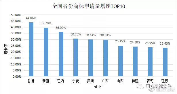 從商標(biāo)申請(qǐng)量增速看,香港、新疆、江西、寧夏、貴州五個(gè)省份占據(jù)申請(qǐng)量增速前5。