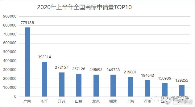 初步統(tǒng)計(jì),2020年上半年,商標(biāo)申請(qǐng)量排名全國(guó)前3的省份/直轄市依次為:廣東省(775188件)、浙江?。?92314件)、江蘇市(272157件)。前10排名中,變化較大的有北京市,排名下降2位,上海市排名下降1位,總體變化不大,商標(biāo)申請(qǐng)大省依然以廣東省為主。排名前10的省份/直轄市申請(qǐng)量合計(jì)2876902件,占全國(guó)總申請(qǐng)量的71.73%,同比下降0.28%。