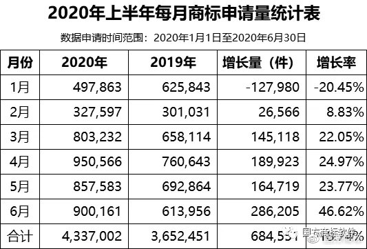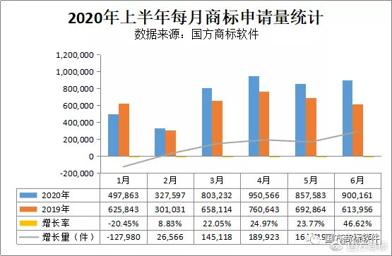 初步統(tǒng)計(jì),2020年1日1日至2020年6月30日,我國(guó)上半年商標(biāo)注冊(cè)申請(qǐng)量累計(jì)4337002件,比去年同期增加684551件商標(biāo),同比增長(zhǎng)18.47%。