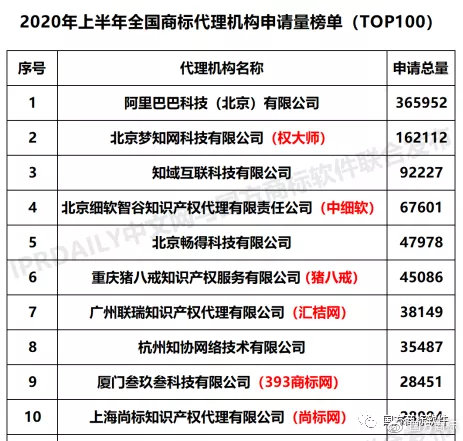 初步統(tǒng)計(jì),2020年上半年商標(biāo)申請(qǐng)量排名全國(guó)前3的代理機(jī)構(gòu)依次為:阿里巴巴科技(北京)有限公司(365952件)、北京夢(mèng)知網(wǎng)科技有限公司(162112件)、知域互聯(lián)科技有限公司(92227件)。商標(biāo)申請(qǐng)量與其他機(jī)構(gòu)拉開(kāi)較大距離的代理機(jī)構(gòu)是排名第1的阿里巴巴科技(北京)有限公司,其申請(qǐng)量是第2名的2倍,遙遙領(lǐng)先其他代理機(jī)構(gòu)。阿里巴巴科技(北京)有限公司在2018年10月開(kāi)展商標(biāo)代理業(yè)務(wù),代理的商標(biāo)申請(qǐng)量一路飆升,經(jīng)過(guò)一年多的時(shí)間仍然保持全國(guó)代理機(jī)構(gòu)榜首的位置。