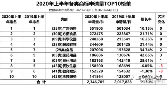 據(jù)初步統(tǒng)計(jì),2020年上半年,商標(biāo)申請(qǐng)量排名前10的商品服務(wù)類別共2346705件,占全國(guó)類別申請(qǐng)總量的54.11%,同比下降1.14%。其中(30類)方便食品、(09類)科學(xué)儀器、(25類)服裝鞋帽、(29類)食品、(05類)醫(yī)藥用品和(03類)日化用品屬于商品類別,申請(qǐng)量為1342207件;(35類)廣告銷售、(43類)餐飲住宿、(41類)教育娛樂(lè)和(42類)科技服務(wù)屬于服務(wù)類別,商標(biāo)注冊(cè)申請(qǐng)量達(dá)1004498件,占總申請(qǐng)量的42.80%,比2019年同期提高2.59%。