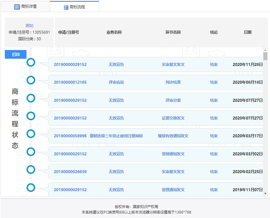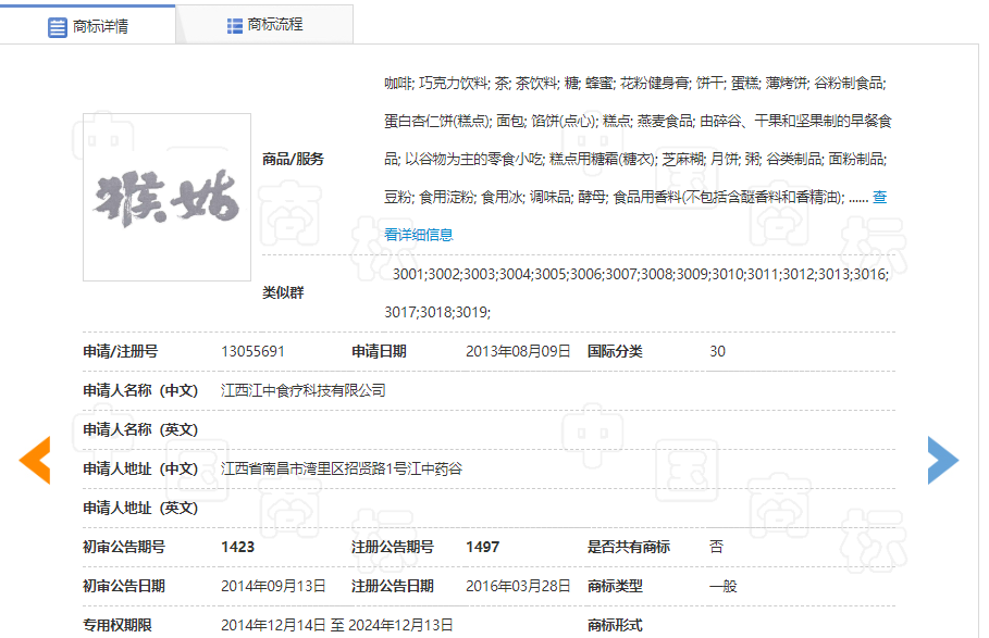 據(jù)了解,江中公司成立于2011年, 截至目前,仍享有第13055691號、第13019935號及第15233214號“猴姑及圖”商標(biāo)(下稱“猴姑”系列商標(biāo))專用權(quán),上述商標(biāo)核定使用的商品為第30類,包括餅干、蛋糕、薄烤餅、面包、糕點(diǎn)等。