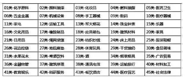 《商標(biāo)注冊用商品和服務(wù)國際分類》(尼斯分類)將商品和服務(wù)分成45個大類,其中商品為1~34類,服務(wù)為35~45類。