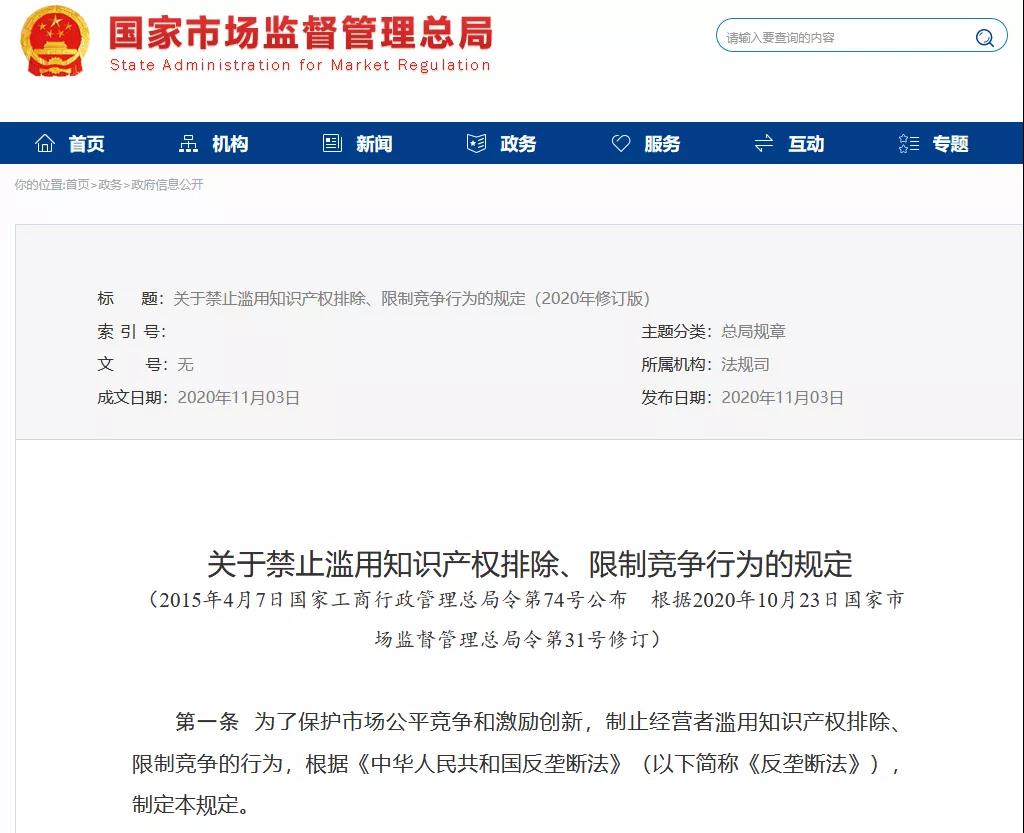 近日,國(guó)家市場(chǎng)監(jiān)督管理總局發(fā)布關(guān)于禁止濫用知識(shí)產(chǎn)權(quán)排除、限制競(jìng)爭(zhēng)行為的規(guī)定,該規(guī)定根據(jù)2020年10月23日國(guó)家市場(chǎng)監(jiān)督管理總局令第31號(hào)修訂。