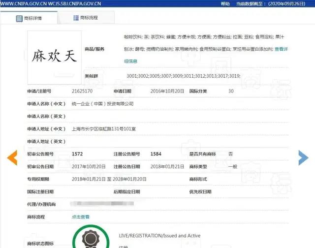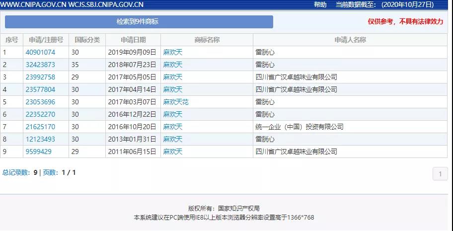 據(jù)查,“麻歡天”“麻翻天”商標(biāo)所有權(quán)人是統(tǒng)一企業(yè)(中國)投資有限公司,兩商標(biāo)在2016年申請,指定使用在第30類調(diào)味品、調(diào)料上。而原告(健心公司)經(jīng)授權(quán)使用以上兩商標(biāo),享有兩商標(biāo)的商標(biāo)專用權(quán)。