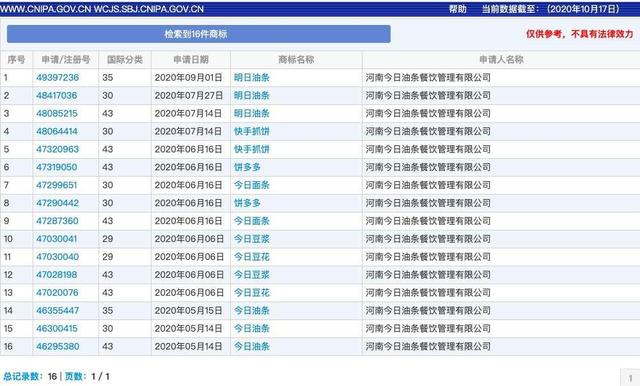 位于河南的今日油條餐飲管理有限公司成立于今年5月13日,注冊資本100萬元。除掛出“今日油條”的招牌外,該公司還申請了今日面條、餅多多、快手抓餅、明日油條等商標,不過尚未注冊成功。