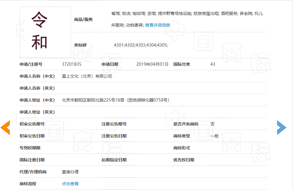 第43類,有125件含有“令和”的商標申請,最早的一件還是北京星上公司的,也已經(jīng)駁回后無效。