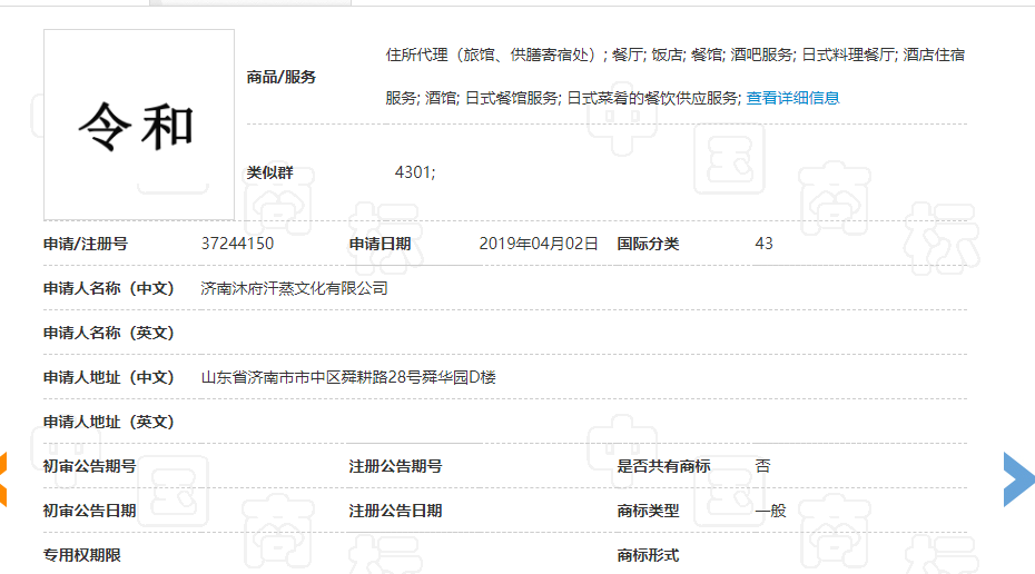 2019年4月2日,一山東沐府公司也申請了第43類“令和”商標: