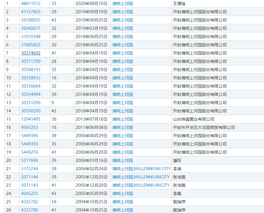 開封清明上河園商標注冊信息共26條,大部分由開封清明上河園股份有限公司注冊,少部分為個人注冊。