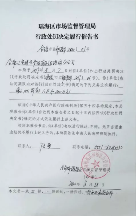 9月4日,安徽商報(bào)融媒體記者獲悉,日前,瑤海區(qū)市場(chǎng)監(jiān)管局對(duì)該公司下發(fā)《行政處罰決定履行催告書(shū)》,要求該公司限期內(nèi)繳納這筆罰款。