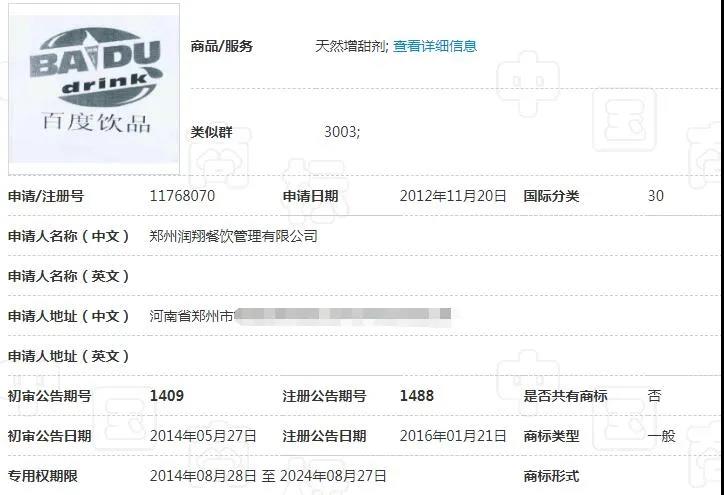 第11768070號“百度飲品BAIDU drink及圖”商標(biāo)是鄭州潤圣商貿(mào)有限公司于2012年11月20日提出的注冊申請,核定使用在第30類“天然增甜劑”商品上。
