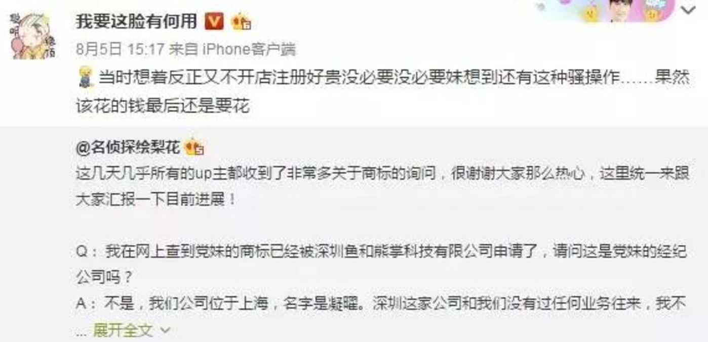 即便有UP主有這樣的意識,由于商標注冊前還需注冊個體工商戶進行掛靠,一些草根UP主也無從下手。此次搶注事件后,被搶注了商標的B站UP主“機智的黨妹”便發(fā)微博稱:“當時想著反正又不開店注冊,(商標注冊)好貴,沒必要沒必要,沒想到還要這種騷操作……果然該花的錢還得花。”