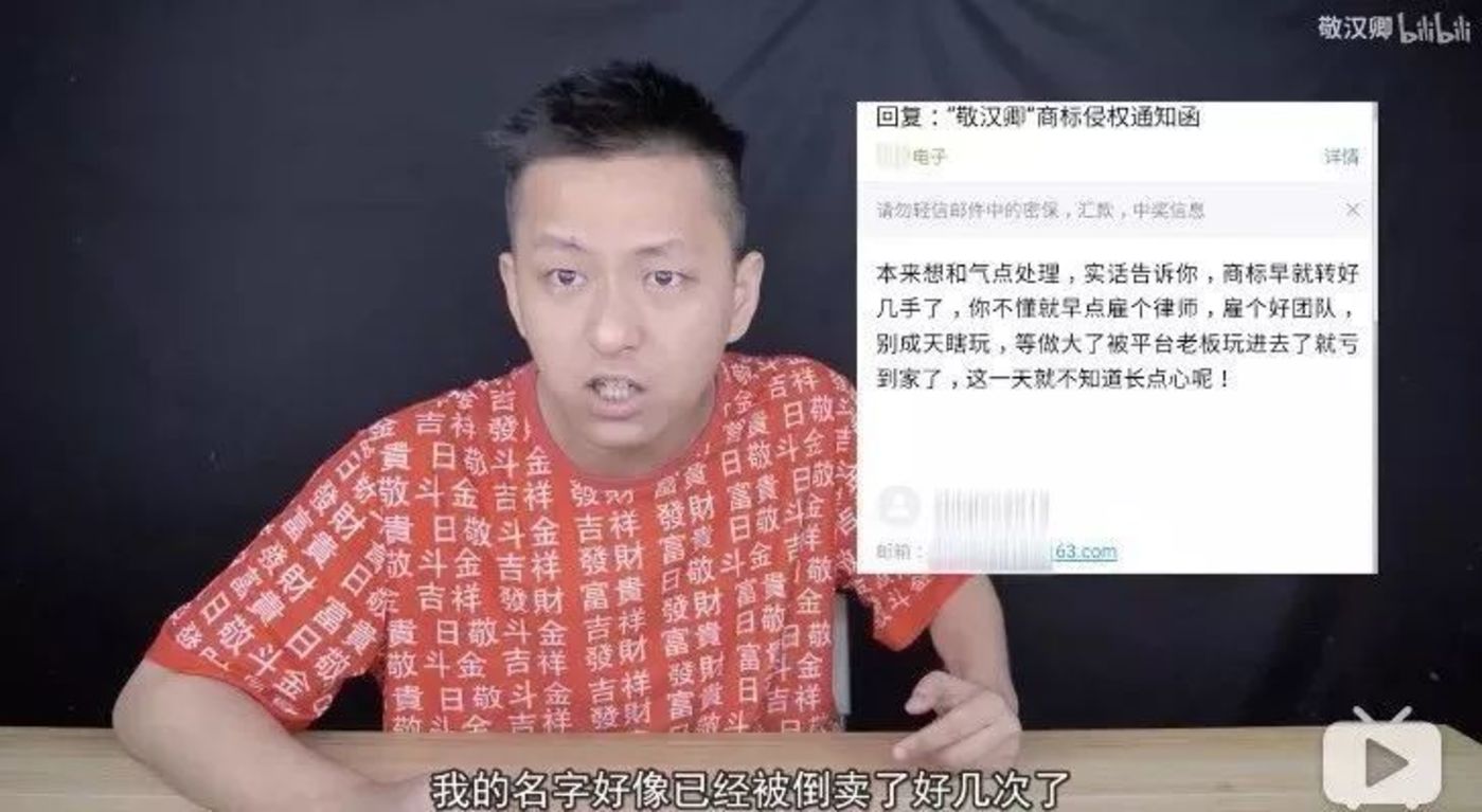 在視頻中他表示,自己被一家名為“安徽省鏡湖區(qū)知橋電子產(chǎn)品銷售部”(以下簡稱“銷售部”)的企業(yè)發(fā)信函通知,稱他所使用的“敬漢卿”一名侵害了該公司的注冊商標專用權(quán),希望敬漢卿能及時修改名字,否則會發(fā)律師函要求各大平臺查封其賬號。