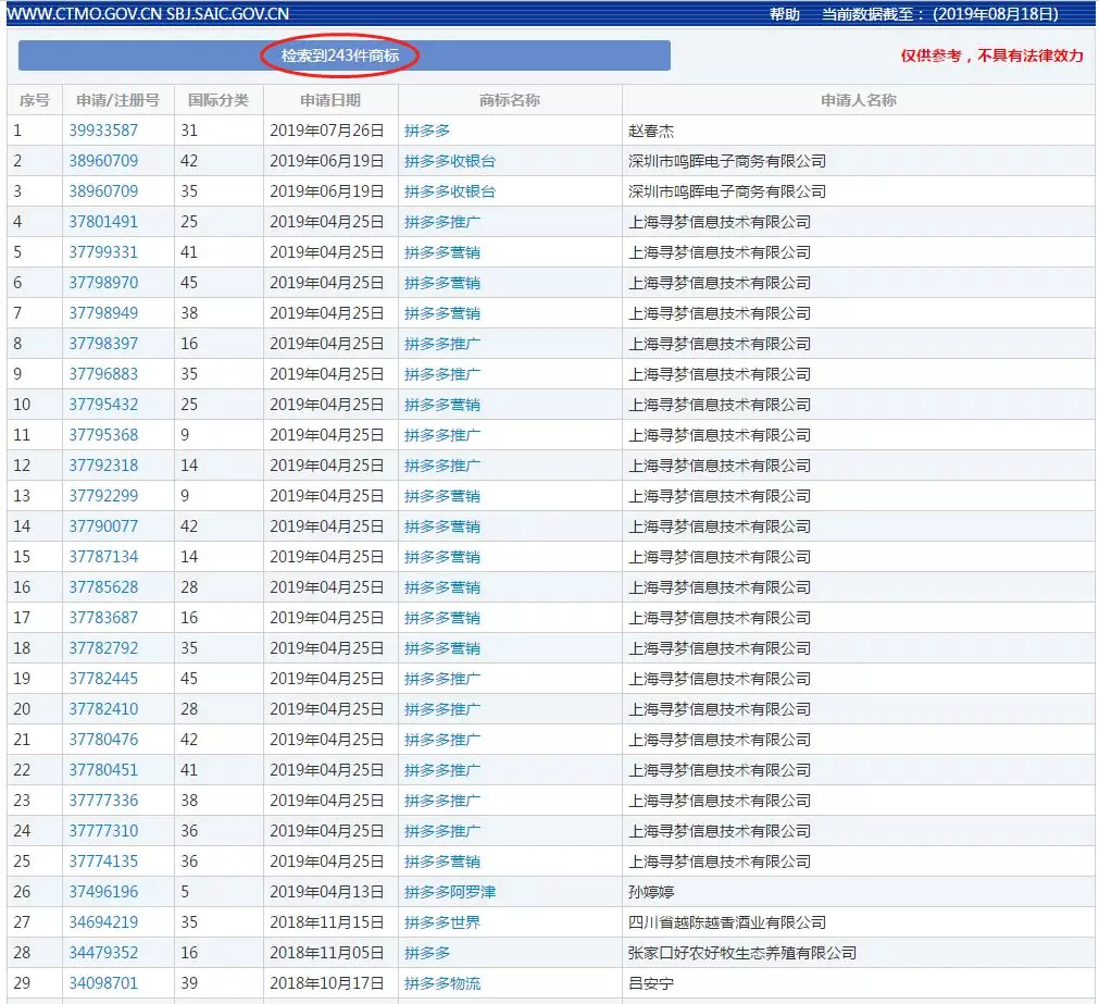 根據(jù)商標(biāo)網(wǎng)查詢,與“拼多多”相關(guān)的商標(biāo)被申請注冊了243次,而拼多多只占了175次,剩下的均為他人提出申請。